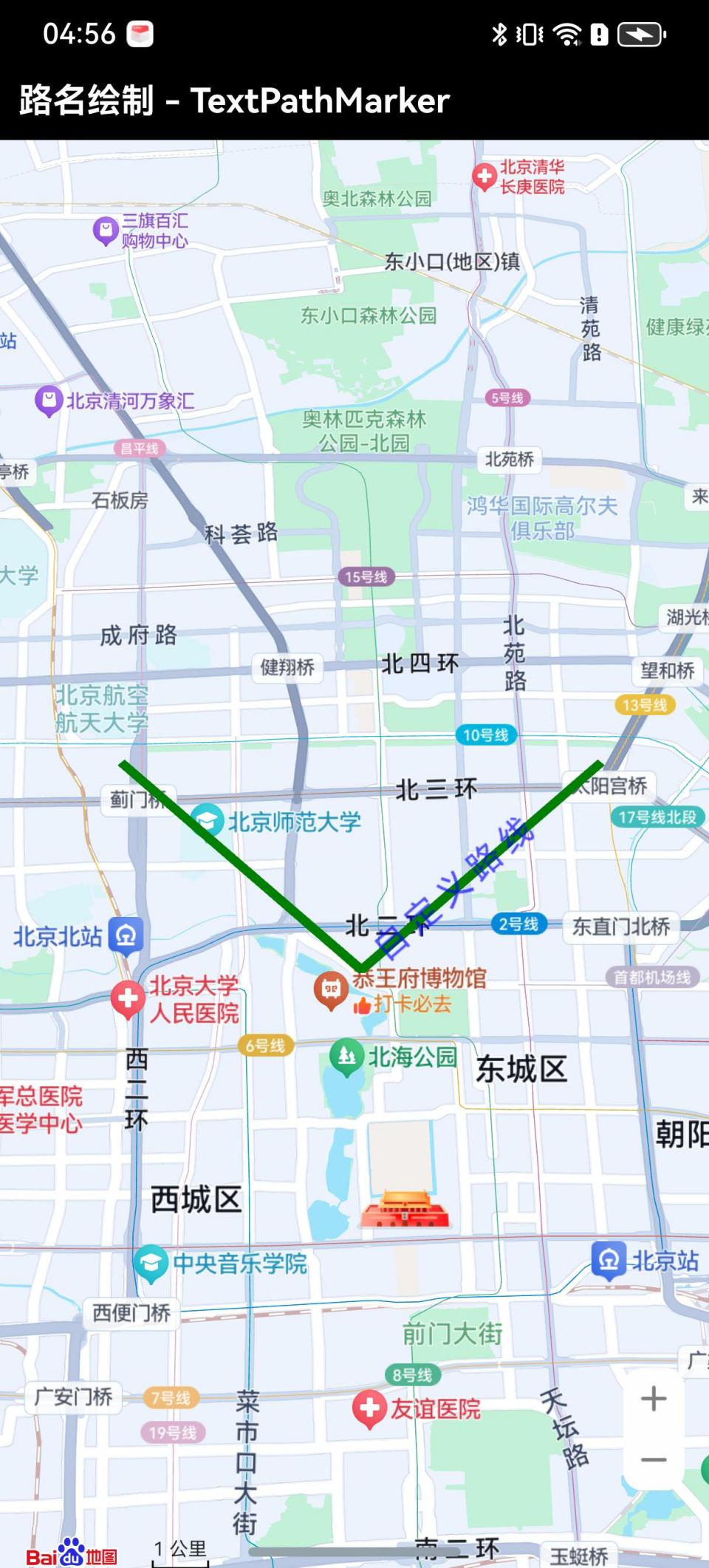 let trace = [new LatLng(39.97923, 116.357428),new LatLng(39.94923, 116.397428),new LatLng(39.97923, 116.437428)];let polyline = new Polyline({points: trace,width: 5,});this.mapController?.addOverlay(polyline);let textPathMarker = new TextPathMarker({text: '自定义路线',textColor: 0xAA0000FF,textSize: 25,points: trace,//textBorderWidth: 10,//textBorderColor: 0xAA0000FF,//textFontOption: 1,})this.mapController?.addOverlay(textPathMarker);