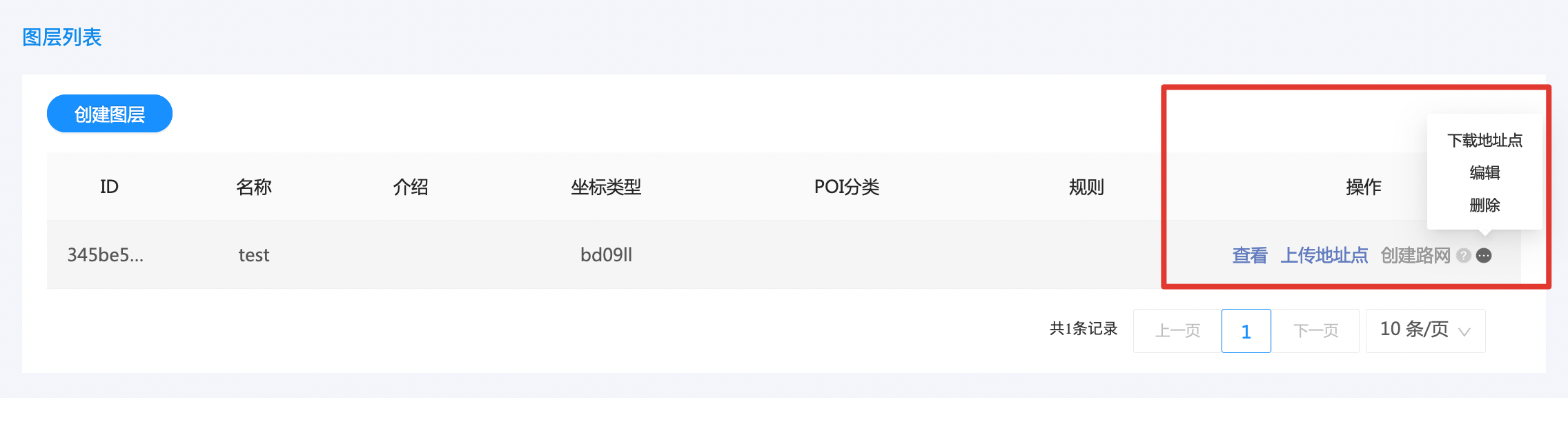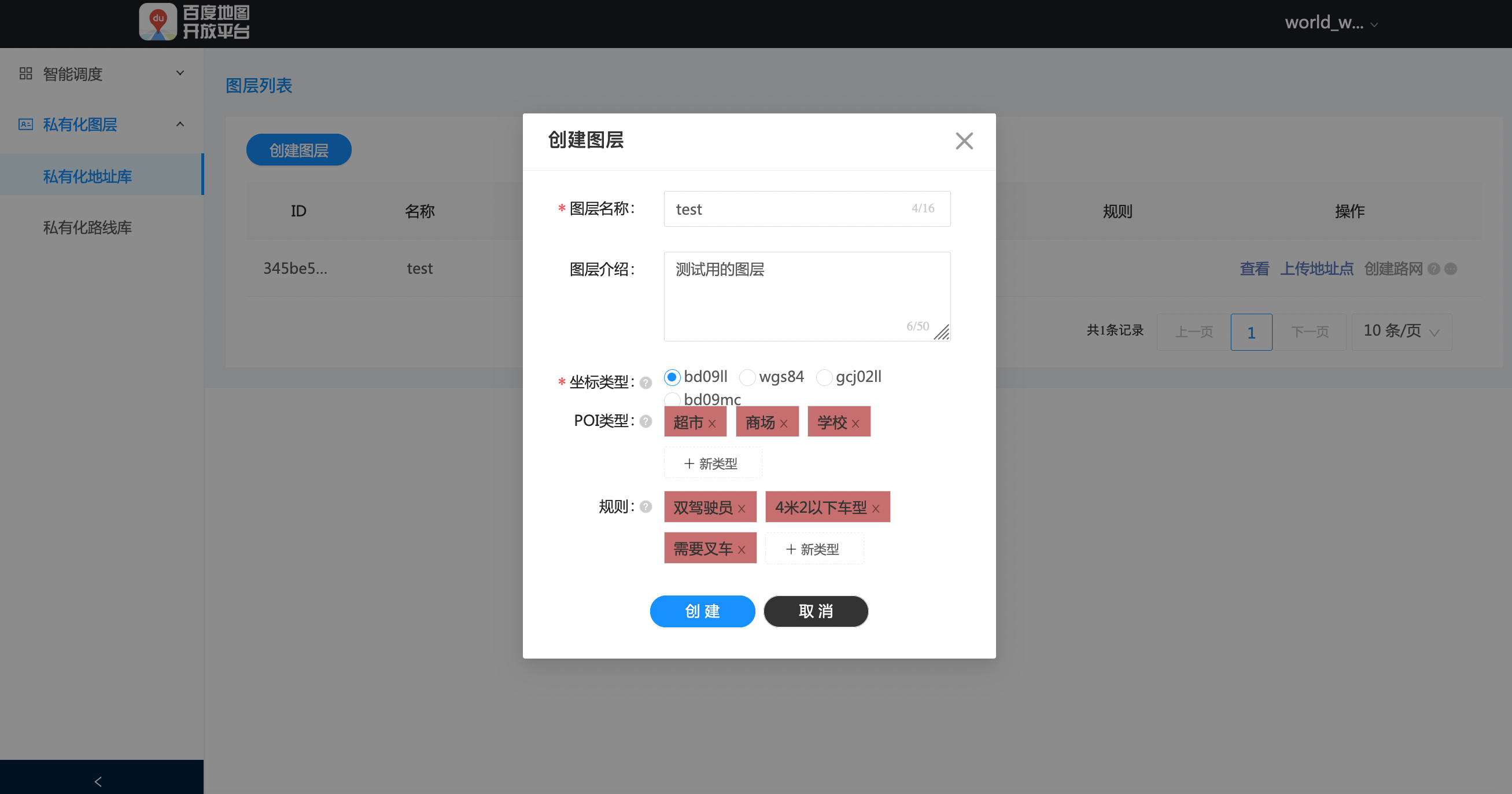 5.编辑:可以修改图层的名称、介绍、POI类型和规则。坐标类型一经创建,将无法修改。