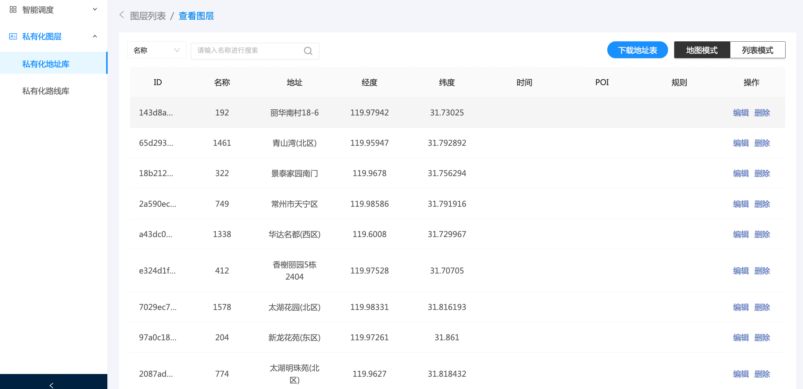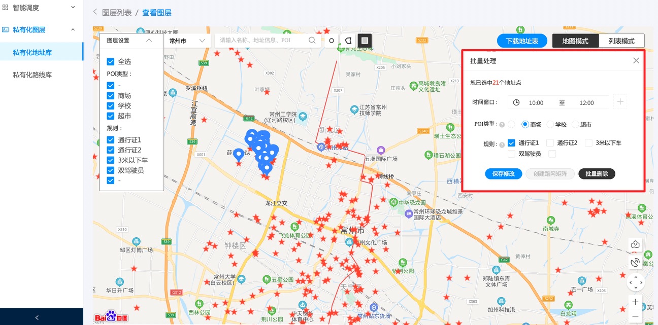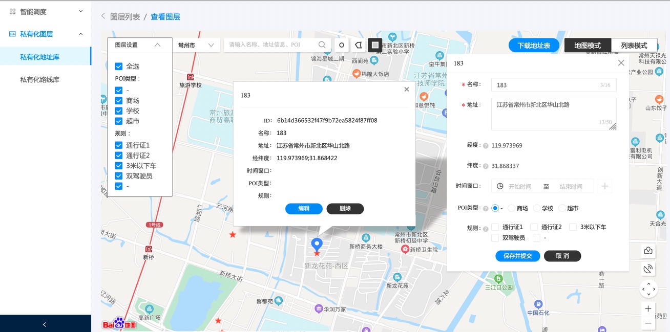 1. 查看:可以用地图模式或者列表模式查看图层上的地址点,并进行后续对地址点的增删改查等操作。