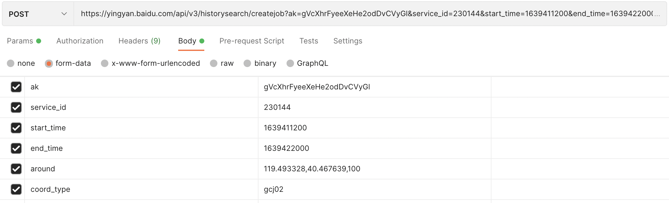 {"status": 0,"message": "成功","total": 2,jobs: [{"job_id":1,"service_id":230144,"start_time":1639411200,"end_time":1639422000,"around":{"center":{"longitude":119.493328,"latitude":40.467639},"radius":100},"coord_type":"gcj02","create_time":"20211215192540","modify_time":"20211215192552","job_status":"done","file_url":"no result"}],}