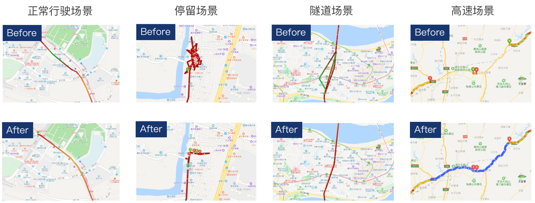 3. 适用性:针对驾车、骑行和步行不同出行模式执行对应的轨迹纠偏策略,并针对停留点漂移进行了单独识别与处理,故对于移动和停留期间的轨迹均有优异的纠偏效果